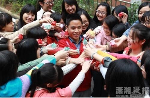 11月10號是學(xué)校的男生節(jié),班上的女生每人給他折了一朵玫瑰花,還專門制作了男生節(jié)的專題視頻和幻燈片。這是湖南師范大學(xué)外國語學(xué)院2012級英語教育二班,唯一的那個男生叫田鑫。