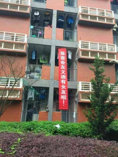 有人說,上大學一定要談一場戀愛,在一個相對純凈的環境里,從一個相對單純的人身上,學會愛一個人。這不,近日,重慶一所大學的大二男生找到女朋友,全宿舍的同學都給他掛橫幅慶祝!重慶郵電大學移通學院一寢室掛出橫幅,上書“恭喜舍友文迪有女友啦!