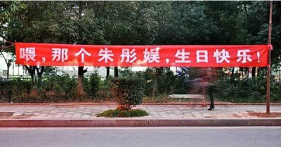 喂,那個(gè)朱彤娛,生日快樂(lè)!”,這橫幅是想演偶像劇嗎
