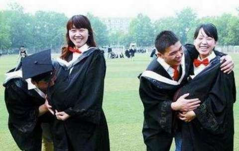 兩對情侶正在拍畢業照。女大學生將籃球放入學士服中扮懷孕,跟男友相約造人。
