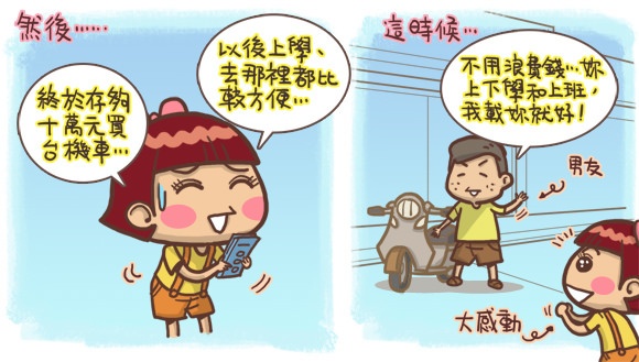 想說買臺機車方便上課 +上班,就不用老是趕公車或是依賴別人載。沒想到此時男友佛心大放送,說交通問題交給他沒問題,要妹子把買機車的 10萬元省下來 (貼心捏)。想不到吼,溫柔體貼的背后竟然有陰謀啊...