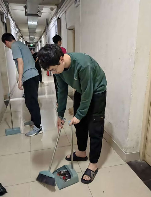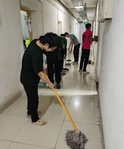在勞動過程中,同學們分工明確,有的負責清掃地面,有的負責擦拭桌椅,還有的負責整理床鋪。大家齊心協力,互相配合,現場一派熱火朝天的景象。經過近一個小時的辛勤勞動,宿舍內外煥然一新,干凈整潔,物品擺放有序,整個生活區域煥發出勃勃生機。