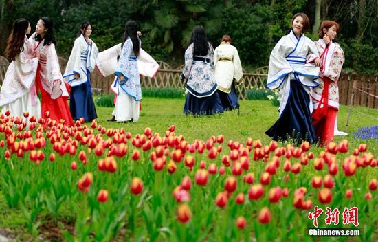 女大學(xué)生著古裝扮靚武漢郁金香花展