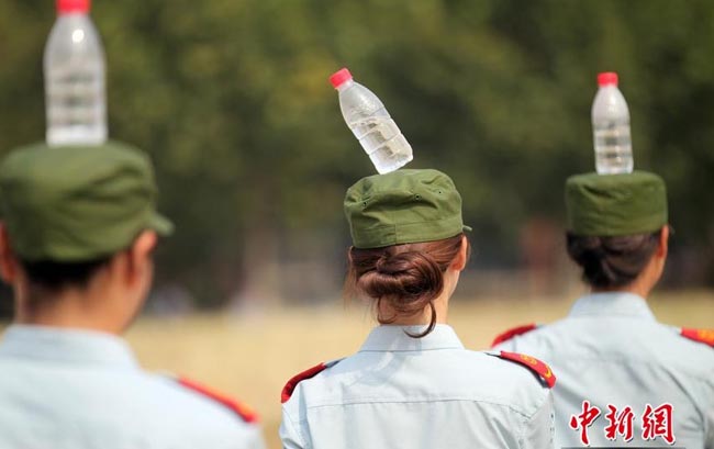 鄭州航空工業管理學院新生頭頂礦泉水瓶進行軍訓