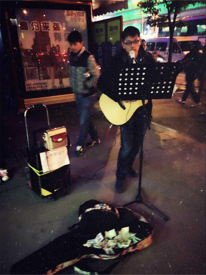 到現在,他還清晰地記得第一次賣藝時的情景,那是2015年的一天,那時的他還對賣唱這一舉動搖擺不定。他找了一個女生一起去常青公園賣唱。他說:“一方面帶個女生可以壯膽 ,一方面,可以唱男女對唱歌曲,豐富歌曲形式。“當時他們不管什么風格或是經典老歌都唱了一遍。正當他想要草草了事收場時,沒想到廣場里爺爺奶奶叔叔阿姨前來給他很多鼓勵, 許多人圍著他們為他們鼓掌鼓掌。現在,劉宗會在沒課的日子出來唱歌,收入已經足夠他自給自足。賣力唱一天,兩小時個小時大概能有兩三百的收入。“也是時好時壞吧。如果有時候給大票的多會好一點。我現在生活費都是自己掙的呢。”說起這些,他不經意驕傲的挺起了胸膛。“不過,比起掙錢,更重要的是,這會讓自己有一個舞臺,去得到別人的認可,非常有成就感。”對于這個在地鐵口賣藝的男孩,他的同學們是怎么說的呢?“雖然課上沒怎么見過她,不過我們歌唱比賽上他是主力,反正還挺有名的吧。而且他還是校園汲音樂隊的鍵盤手,每天晚上在操場無償唱歌,在學校可有人氣了。”當被問到會不會覺得賣藝這種方式有些不妥時,一位同學說:“我覺得還好吧,就是一個把興趣和賺錢結合起來的方式,挺好的。”
