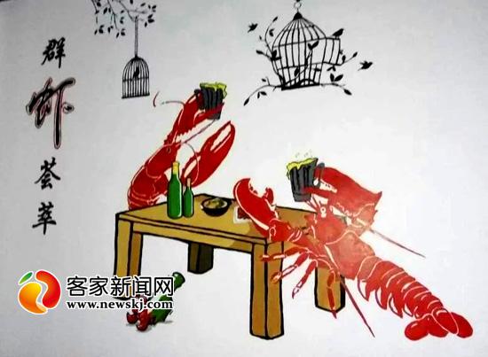 陳佳興在餐廳作墻繪。 據了解,陳佳興是江西理工大學環境設計專業的學生,今年寒假期間,他和同學一起打工,為贛州一家以“蝦”為主題的餐廳作墻繪。經過一周的創作,群蝦薈萃、蝦說、萬蝦奔騰等一系列創意“蝦繪”躍然墻上。萌態十足的“寒假作業”一經曬出,就引來不少網友圍觀點贊。