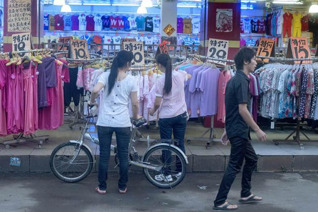 廠區周邊普通賣鞋子賣衣服的比擬廉價,不是說這些工人沒錢買,而是很多貨都可以低價從廠區內部拿。圖為女工正在選購花花綠綠的衣服。