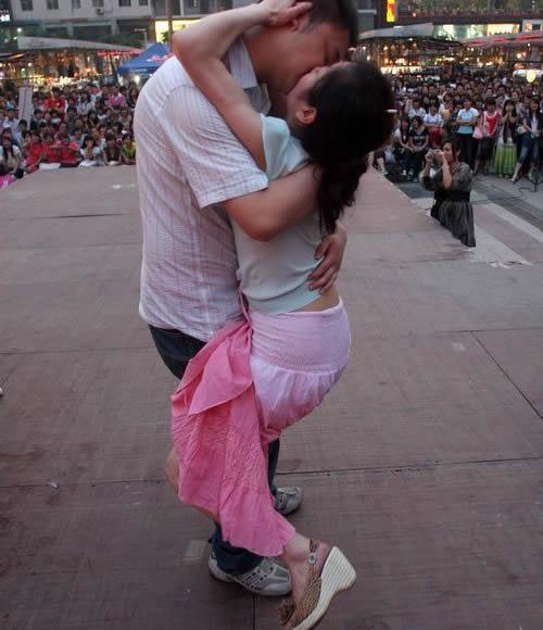 情侶街頭舉行接吻大賽,雙腿把男的夾緊