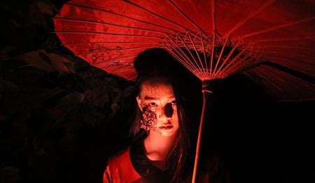 “專業戶”們化好妝后就開始出動了,按照自己的角色,有的在園區閑逛,與游客互動,不時出來“嚇”游客;有的坐在榕樹底下,給游客講中國傳說中的鬼故事;有的坐在“奈何橋”上,扮演“孟婆”,手里還拿著湯;有的躲在暗處,不時突然出現在游客面前;有的躺在面包盒里,扮“人體面包”;有的去鬼屋,在里面做固定的“鬼怪”;有的則在園區內參加萬圣夜演出。
