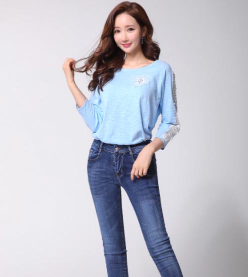牛仔褲一定要突出女人腰部的特點,要部寬,大腿至小腿要從粗到細。