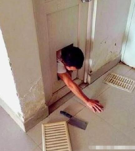 這個同學,你這是學貞子?還是學的甄子丹?從個透風口出來也是有點身材啊!而且這力道,估計學的甄子丹?從廁所里爬出來的貞子?嚯,夠不容易的!等等那把菜刀是怎么回事?