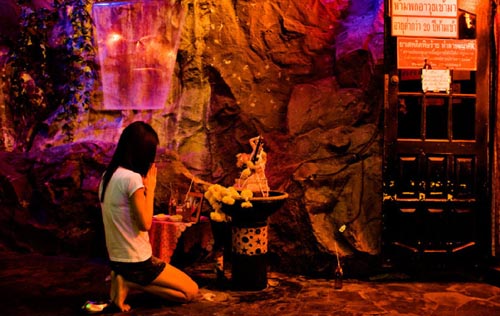 曼谷,一名變性舞女在“go-go bar”門口設立的神龕前祈禱。