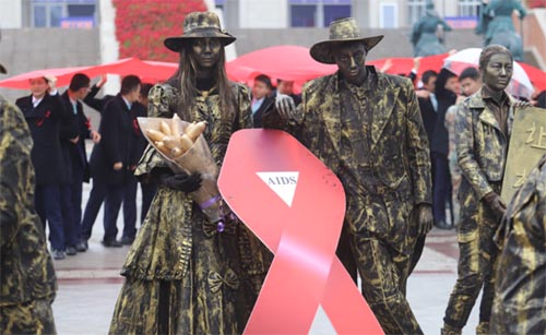 高校用行為藝術宣傳防艾,學生扮銅人創意十足