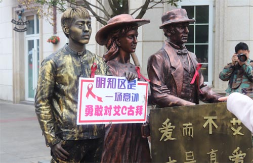 高校用行為藝術宣傳防艾,學生扮銅人創意十足