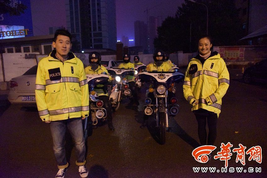 【21:00】郭家廟巡邏結束,何雨陽和徐婷站在巡邏隊前和隊員們合影留念,他們即將前往鳳城五路盤查點體驗盤查工作。