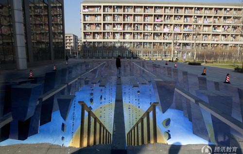 小崔告訴記者,他們的創作團隊在2015年創作的第三幅巨幅立體畫,他們是通過巨幅連環3D畫,展示一種靠團隊創業的信仰,2015年7月開始,他們先后在鄭州和山東街頭創作完成了《無盡之門》、《進取之路》、《我的太陽》三幅巨作,總裝繪畫創作面積1600平方米。