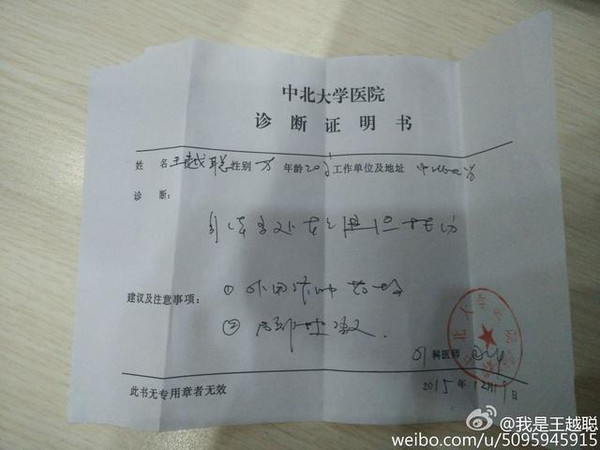 在我是王越聰 的微博自述中,提到她被同宿舍的三名舍友多次“欺負(fù)”,讓她無法忍受。“用凳子向床鋪上的我猛砸,將我的手打傷。” “我與她爭論,她突然拽住了我的頭發(fā),并打了我兩個耳光。同寢室的肖雪萌過來勸架,她不但沒停手,還更加瘋狂,搬起凳子來砸我的腦袋。由于害怕,我跑出寢室,在躲閃過程中被凳子砸傷了手臂。” “手打掉了我的眼鏡并拽住我的頭發(fā)把我往墻上撞,我被打蒙了,由于我的兩只胳膊做過手術(shù),根本無力反抗,幾次被她拽著頭發(fā)撞到柜子上。”