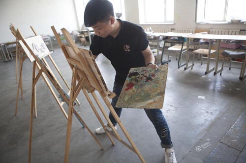 一幅立意新穎、做工精巧的釘子畫需要多少枚釘子?蔡孫翔介紹:“因?yàn)楝F(xiàn)在我的作品都不是很大,所以一般是兩三百顆左右,一幅作品從構(gòu)思到完成差不多3天時(shí)間。”圖為蔡孫翔經(jīng)常一個(gè)人在教室內(nèi)進(jìn)行創(chuàng)作。