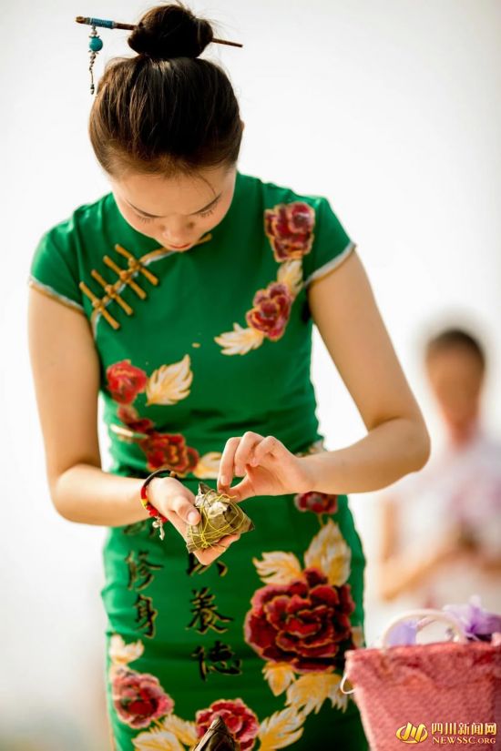大學美女準空姐穿旗袍跟食堂阿姨學包粽子