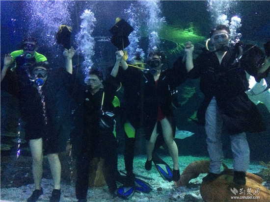 6月25日早上10點,水下畢業照小組就來到武漢海昌極地海洋公園。大家都是第一次潛水,難免有點緊張,前一小時拍出的效果面部猙獰。同學們向公園潛水員請教之后逐漸掌握潛水技巧,這組唯美的照片最終在5人的努力下完成。