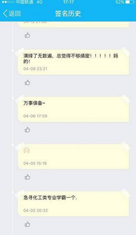 “多鍛煉~反應(yīng)速度得提高。”他第一次更新了這個簽名。緊接著是4月2日,更新為“急尋化工類專業(yè)學(xué)霸一個”。