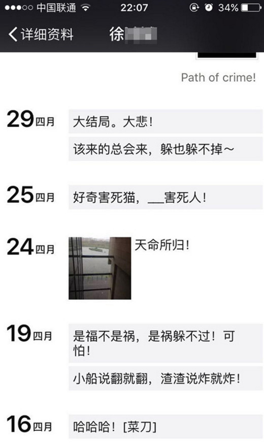 沒有人能指出,是在什么時候,徐斌把社交軟件簽名改成了“path of crime”(罪惡之路)。
