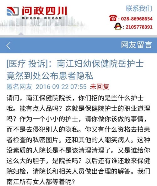 四川一護士拍患者婦檢私密照傳網上"討論"