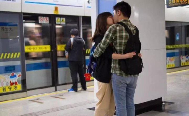 在站臺那樣人多的場合,情侶們也不忘去親密