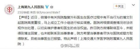 爆料上海九院余東利用手術(shù)機(jī)會性侵女客戶并導(dǎo)致手術(shù)失敗毀容,在網(wǎng)上引起了強(qiáng)大反響。上海第九人民醫(yī)院就此發(fā)表聲明:近日,微博中有關(guān)我院整復(fù)外科醫(yī)生在醫(yī)療過程中有不當(dāng)行為的博文引起醫(yī)院高度重視,馬上成立工作小組進(jìn)行核實調(diào)查。醫(yī)院將根據(jù)調(diào)查情況依法依規(guī)作出處理,以切實維護(hù)患者和醫(yī)生的合法權(quán)益。昨日院方微博聯(lián)絡(luò)至今,未能得到博主回復(fù),也未能聯(lián)系到當(dāng)事患者,院方希望當(dāng)事患者盡快與醫(yī)院或警方取得聯(lián)系。目前當(dāng)事醫(yī)生已報警。特此聲明。