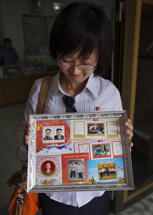 這位朝鮮大學的女大學生說,朝鮮約會的情景很保守,而且未婚先孕是絕不會發生的,因為在朝鮮這些是違反道德行為的,圖為金小姐自豪地展示她收集的印有朝鮮領導人的郵票。