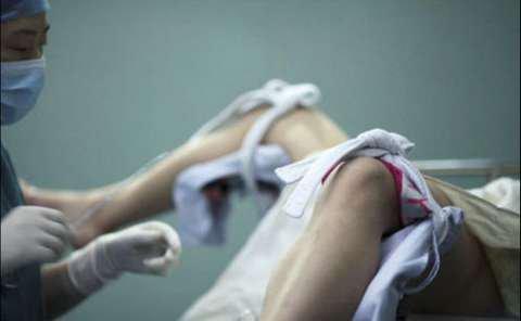 圖為一名醫生正準備開始手術,患者的腿被綁到手術架上,防止滑落。