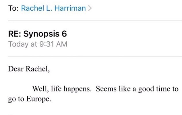 不久后,Rachel收到教授的郵件,教授接受了她遲交作業(yè)的理由,并安慰她:生活就是這樣,可以去歐洲散心。