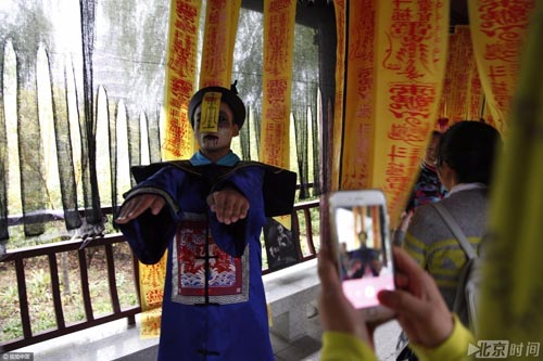 在濟南一景區內,一位小伙扮演古代“僵尸”在鬼屋內與游客互動游戲。據了解,萬圣節前夕,不少商家為了吸引游客,運用萬圣節節日大做文章,用各式各樣活動來招引游客。一位扮演者稱自己是大學生兼職扮演“僵尸”,自由發揮裝鬼,日掙上百元錢。