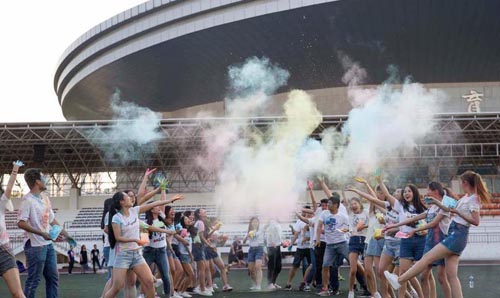 山西太原,大學生們在校園內拍攝“彩色跑”畢業照。