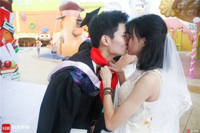2017 年 6 月 11 日,湖北省武漢市。12 對(duì)武漢大學(xué)生畢業(yè)生在武漢歡樂(lè)谷舉行了一場(chǎng)別開(kāi)生面的 " 畢業(yè)婚禮 "。新郎們分別身穿學(xué)士服、手拿籃球、騎摩拜單車(chē)飛奔到新娘身旁,單膝下跪大喊:" 女神,我要和你生猴子 ",贏得新娘芳心,新娘親自為新郎系上紅領(lǐng)巾激情熱吻羨煞旁人。