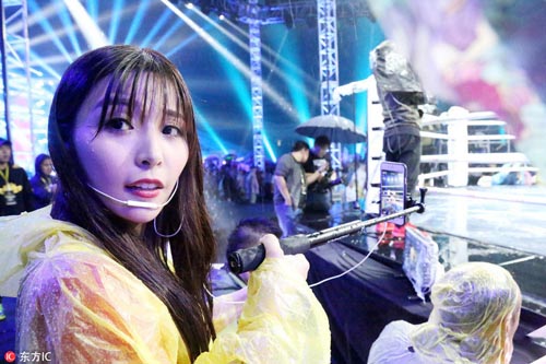 雖然在雨中渾身被淋濕,但她依然在賽場內拿著手機,在近5個多小時的時間內,堅持隨時隨地進行現場直播,與網友頻繁進行互動。