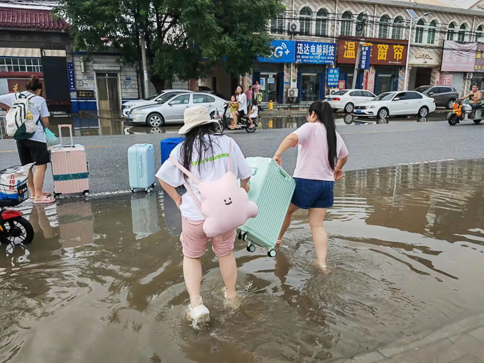 在前往營地的路上暴雨積水擋路,學生家長幫忙拿行李 孫昊攝