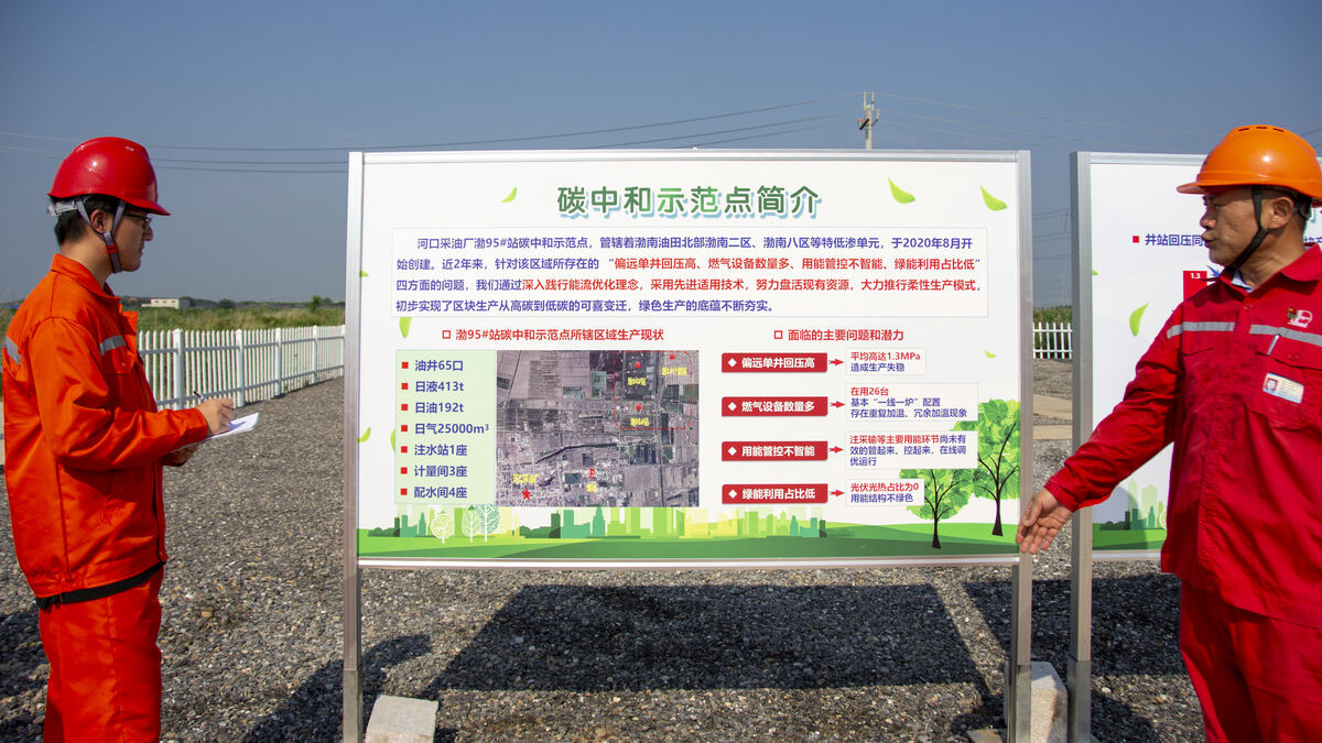 首先講解員向實踐隊成員介紹了渤95井面臨的一些困境與解決方法。如通過推廣雙腔混輸+多能互補工藝解決了能源管控不智能、綠能利用率占比低的問題。隨后實踐隊成員參觀學習展板并了解到,截至到目前,渤95井碳中和點建設已取得豐碩成果,其正沿著“低碳化向無碳化”發展路徑,打造綠色發展標桿,力爭早日實現碳中和目標。最后實踐隊成員參觀了渤95井的抽油機所采用的新技術,如一體化溫壓傳感器,以及對多級泵的新型保護措施,學習了更加有效的管道保護方法。