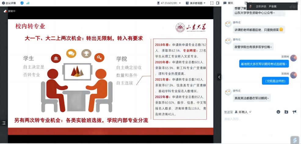 兩場交流會線上參會人數共計135人,學長與新生親切交流、答疑解惑,三位“自強之星”的分享講好了新時代學生資助故事。與會新生表示從中受益良多,走進榜樣的世界,他們將以璀璨星光為指引,汲取奮進力量,點亮青春夢想。習近平總書記在黨的二十大報告中強調,全面貫徹黨的教育方針,落實立德樹人根本任務,培養德智體美勞全面發展的社會主義建設者和接班人。 “向陽有花開”榜樣交流會的召開正是山東大學唐社筑夢南國之翼隊聚焦“發展型”資助育人的重要舉措。