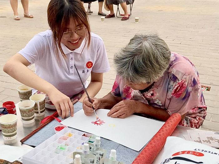 藝術推介鄉民,喚醒美之感知“美美與共,趣在鄉中”,團隊堅信,只有鄉建主體足夠了解村莊之美,才能孕育出自發性的探索。于是,團隊從鄉民的需要出發,以其為“美”的創造主體,通過開展鄉村美育主題推介會、鄉村美學主題藝術展,舉辦藝術賦能產品、開設美育課堂等系列活動,將美的轉化與應用推介給鄉民。在推介會上,隊員們與鄉民合作,記錄其生活經歷和美學感悟,并展開二次創作形成藝術作品,展現五埠村所孕育的獨特精神風貌之美。此外,在美育培訓中,村民在隊員們的教學下,學習了繪畫、攝影等藝術形式,在渠道上體驗新型鄉村美的表達方式,最終設計出了包含鄉村特色的繪畫作品與文創產品。