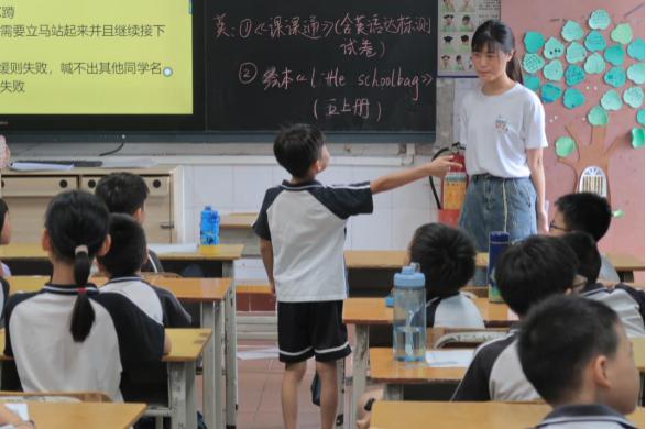 2023年7月17日,開營儀式結束以后,在華南師范大學物理學院團委學生會服務隊教務組成員賈君怡和陳映吟的帶領下,成長營一班的小朋友們一起來到教室里進行開班儀式。在開班儀式開始之前,服務隊隊長劉芷蔚對小朋友們進行了點名,被點到名的小朋友也積極回應,大聲地喊“到”,非常的活躍熱情。