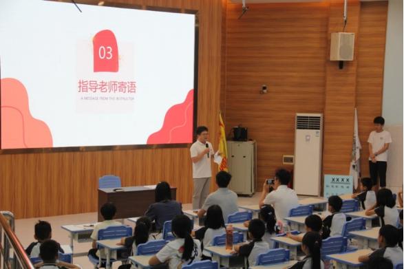 在隊長發言環節,劉芷蔚作為團學服務隊代表發表講話,概括了本次暑假成長營的課程,主要包括創新思維和文藝素養兩大板塊。其中,創新思維包括科技強國系列課程、基礎物理實驗建設和興趣課堂。文藝素養板塊包括中國非遺傳統文化的傳承、集市游園、文化小課堂、文藝匯演等活動。芷蔚隊長的發言,代表著團學服務隊所有隊員對本次成長營的激動和期待。