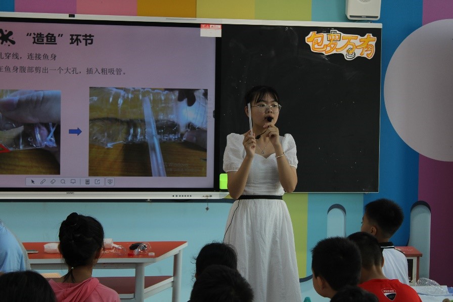 其二,為了加深小朋友們對中華傳統文化的認識,更好地加強對順德特色魚燈文化的傳承,華南師范大學物理學院團委學生會服務隊策劃組成員黃瑜晴在2023年星槎小學暑假成長營中為星槎小學的小朋友們準備了一節以“小小魚燈來集福”為題的特色活動。