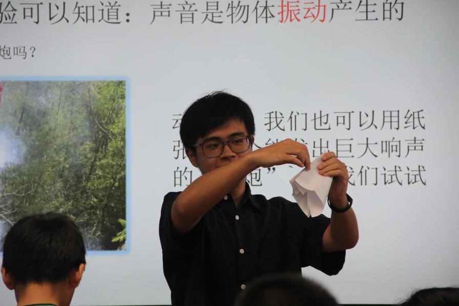作為這節課的引入,何思睿老師首先邀請小朋友們分享在生活中他們能聽到的各種各樣的聲音,例如歌手的歌聲,不同樂器發出的不同聲音,雨聲,風聲,汽車馳騁的聲音等,然后向小朋友們拋出疑問:聲音是怎么產生的呢?借此進入課堂的第一組實驗:聲叉實驗。聲叉實驗的內容如下:用敲擊后的音叉放入水中,觀察水中的情況;用敲擊后的音叉放在鋪滿彩色紙屑的緊繃塑料薄膜中,觀察彩色紙屑的運動情況。實驗結束后,小朋友們積極舉手分享觀察到的實驗現象:振動的音叉會使水面產生振動,讓彩色紙屑跳動。隨后何思睿老師總結結論:聲音是由物體振動產生的。隨后何思睿老師帶領小朋友們制作紙炮,深入體會聲音是由物體振動產生的。至此,課程的第一部分結束。