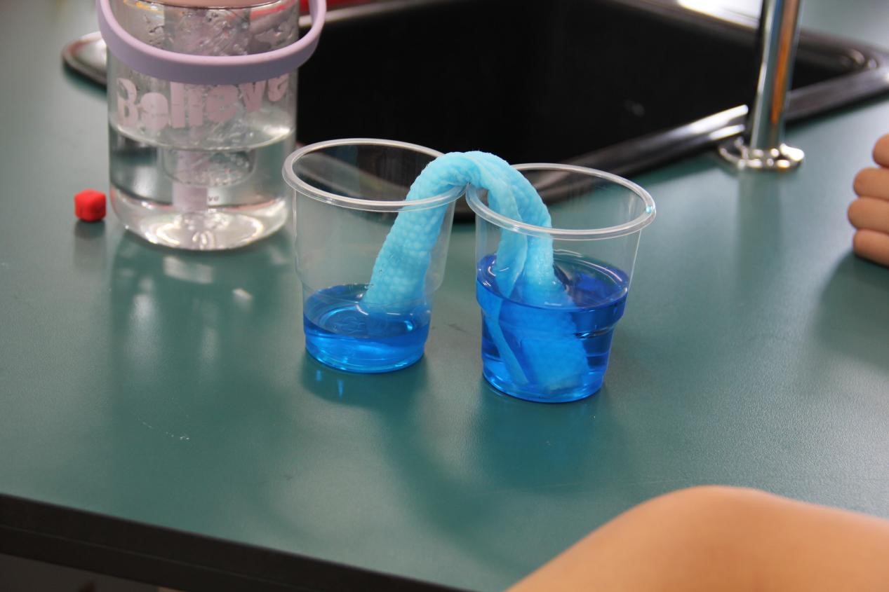 之后,陳遠嫻老師讓小朋友們動手做“紙巾來送水”的實驗,希望利用洗臉巾、色素與一次性杯子等常見的道具,向小朋友們直觀展示毛細現象的過程。在實驗中,通過滴加色素,小朋友們能夠清楚地觀察到洗臉巾中水分的運輸以及一次性杯子中水分的積累,從而直觀地感受到毛細現象對于水分貯藏和運輸的影響。在實驗完成之際,陳遠嫻老師向同學們提出“為什么在最后液面會相平,而不是一高一低”的問題,讓小朋友們復習了壓強的概念,加深小朋友們對科學知識的理解。
