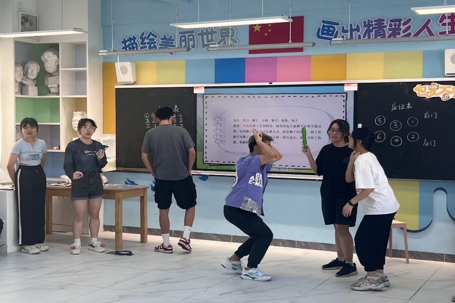 隨后就進入了本次活動的最后一個環節,“小小舞臺劇”。本環節是一個小朋友們的自主創作環節,活動開始前,每個小組將分到一張節目卡片,上面進行了簡單的分工和簡短的劇情,本環節需要小朋友們通過對劇情的聯想,然后進行分工,以小組合作的形式完成一個舞臺劇的創作。在開始之前,助教老師為小朋友們演示了舞臺劇具體的表演形式,助教老師生動的表演讓小朋友們看得哈哈大笑,開始提起了興趣。