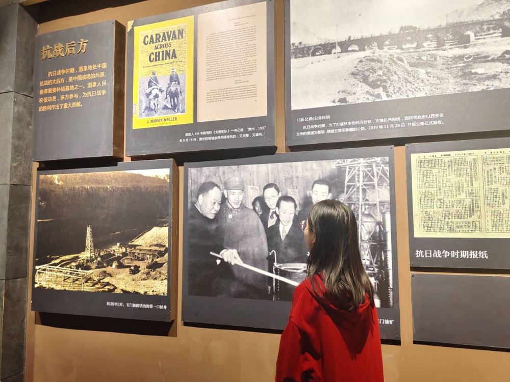 首先,實踐隊成員們前往玉門油田陳列館,認真觀看每一幅照片,每一件藏品。成員們了解到玉門油田是中國最早發(fā)現(xiàn)和投入規(guī)模開發(fā)的油田,曾經(jīng)為抗日戰(zhàn)爭的勝利做出過杰出的貢獻,并培養(yǎng)出一大批以“鐵人”王進喜為代表的石油工作者。跟隨歷史的足跡,成員們感嘆前輩們在艱苦的條件下創(chuàng)造的驚人成就,紛紛表示應(yīng)當傳承先輩對待事業(yè)拼命忘我、在艱苦環(huán)境中不斷奮斗的精神。隨后,成員們來到抗日戰(zhàn)爭陳列館,重點參觀抗戰(zhàn)后方和酒泉解放這兩部分展區(qū)。走過陳列館的路上,隊員們了解到酒泉各地區(qū)解放時間以及酒泉人民在抗日戰(zhàn)爭中的無畏精神。勿忘國恥,吾輩需自強,成員們心中悲痛與憤恨交織,同時也堅定了向先輩學習的決心。最后,成員們來到了酒泉改革開放史陳列館。展館中播放著很早以前對市民的采訪畫面以及拍攝的酒泉城區(qū)變化的照片,展示了中國共產(chǎn)黨領(lǐng)導下的革命斗爭和建設(shè)成就。改革開放讓酒泉的城市面貌煥然一新,是黨和國家讓這片土地上的人民生活更幸福。在這座展館中,隨處可見的是人們幸福的笑容。成員們在參觀中認識到了黨領(lǐng)導的正確性,更加堅定了追隨中國共產(chǎn)黨的腳步。