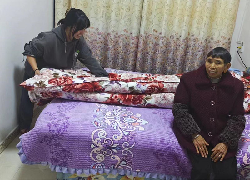 實踐團成員發現養老院部分老人行動不便,難以自行整理自己的床鋪,這不僅影響了老人的生活質量,也讓居住環境顯得凌亂不堪。志愿者幫助老人整理床鋪,為老人創造出整潔舒適的生活環境。