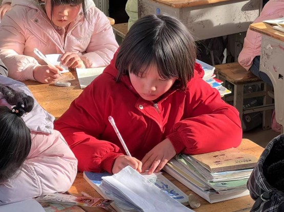 折紙課上,山東大學(xué)電氣工程及其自動(dòng)化專(zhuān)業(yè)的大一學(xué)生劉雙鳳作為折紙老師,正在環(huán)視整個(gè)教室,給四年級(jí)的小朋友們一一提供幫助,教學(xué)折眼鏡、帽子、千紙鶴等有趣的小物件,但她注意到了最前排的一個(gè)小男生,在其他同學(xué)興致勃勃的翻折手中的卡紙時(shí),他卻坐在座位上雙手插兜保持不動(dòng),折紙老師劉雙鳳表示十分好奇,“說(shuō)實(shí)話(huà),那時(shí),我以為那位小朋友是對(duì)折紙不感興趣或者跟不上折紙步驟,對(duì)他也就多加留意了一些,但我沒(méi)想到,他下課后找到我,怯生生的小聲詢(xún)問(wèn)我,老師,下節(jié)課能教一節(jié)不用動(dòng)手的課嗎,手凍得太冷太疼了。說(shuō)完我就看見(jiàn)他手上長(zhǎng)滿(mǎn)觸目驚心的凍瘡的傷口,那時(shí),一想到這的小朋友們?cè)谝酝酥烈院蟮穆L(zhǎng)時(shí)光里都要在這樣的嚴(yán)寒中刻苦學(xué)習(xí),心里真的不太好受,希望未來(lái)他們都能用努力澆灌出夢(mèng)想的參天大樹(shù)。”隨著擔(dān)當(dāng)助教的管理學(xué)院大二學(xué)生明傲天老師的一聲高喊“同學(xué)們,你們的眼鏡折好了嗎?快舉到高處讓老師看到!”小朋友們的燦爛笑容在相機(jī)中被永久定格,小朋友們的雙眼泛著熠熠光輝,仿佛美好的未來(lái)已然向他們招手。