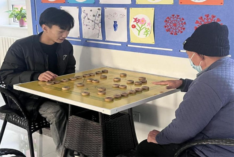 實踐團成員們通過前期的調查了解到,許多老人對傳統棋類游戲有著濃厚的興趣。于是,他們精心策劃了一場別開生面的下棋交流活動,活動吸引了養老中心眾多老人積極參與。